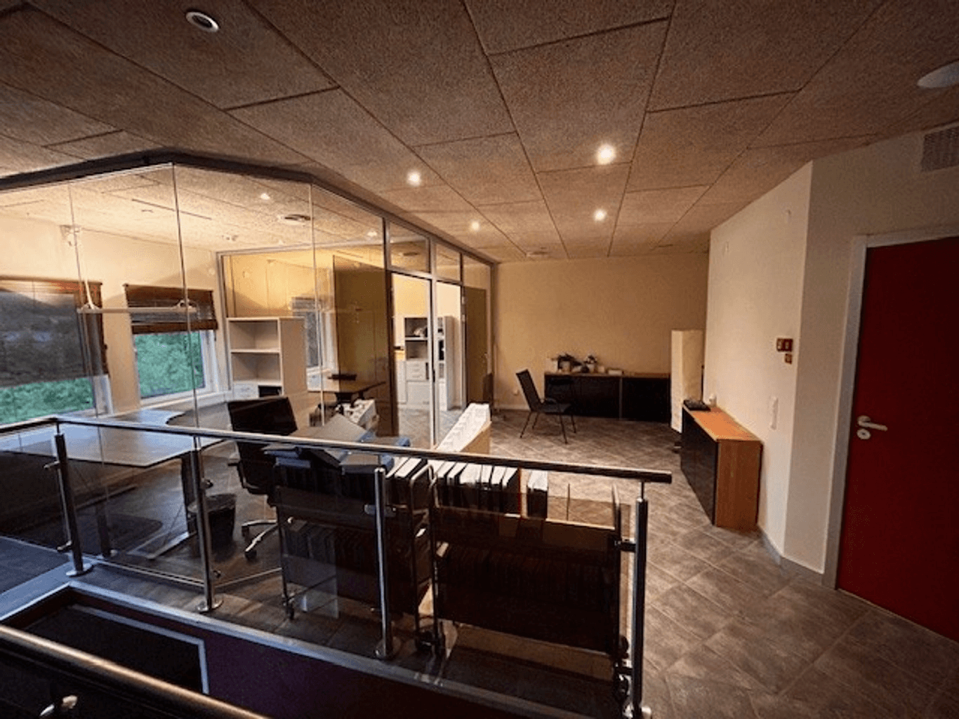 Hall i ett plan samt kontor i pl2.