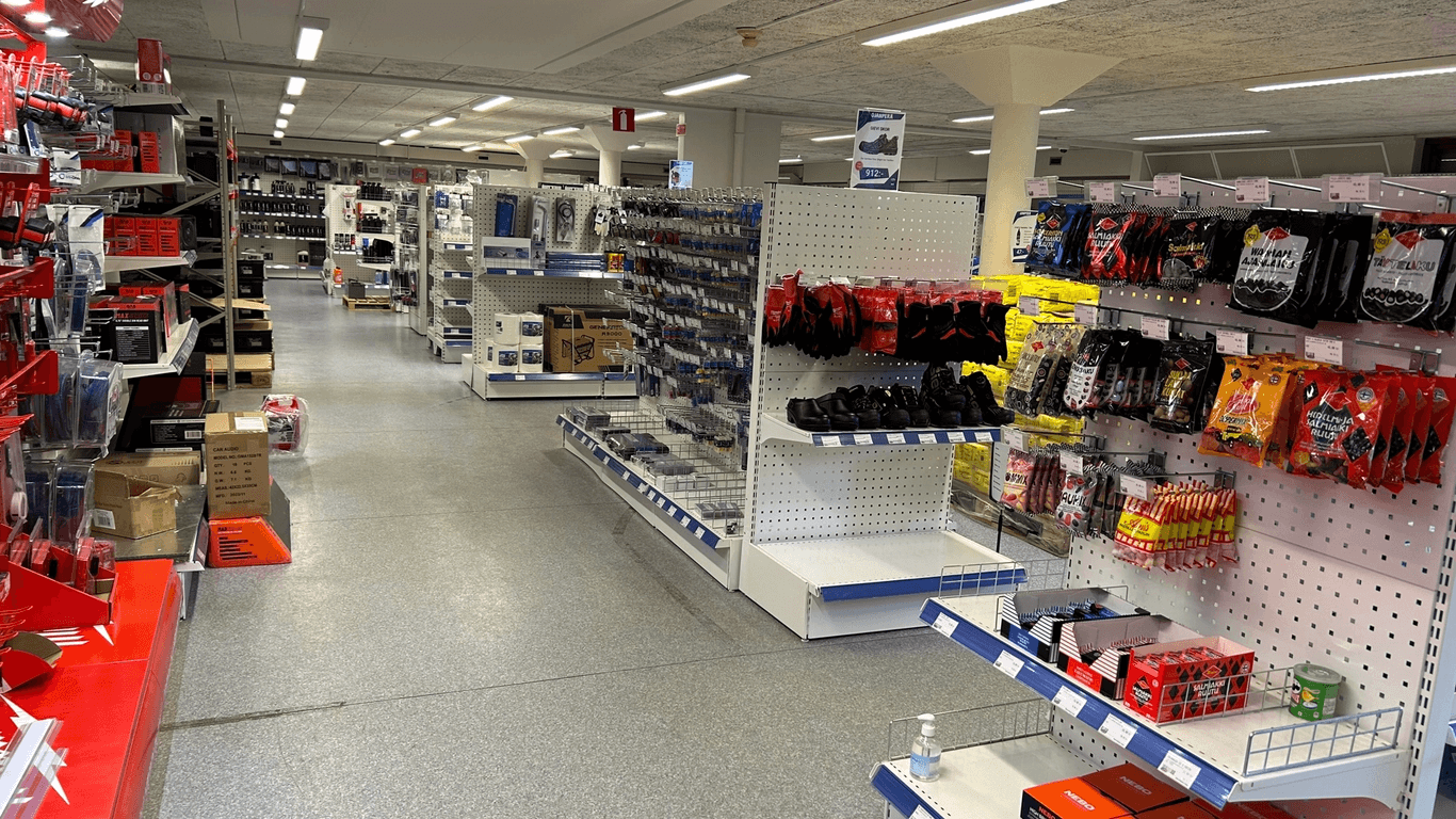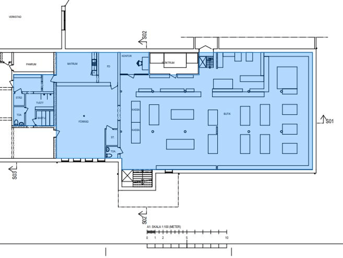 Öppen och anpassningsbar lokal en halv trappa ner. Lokalen nyttjas idag som butik. Personalutrymmen med omklädning och bastu. Varuhiss och personhiss finns.
