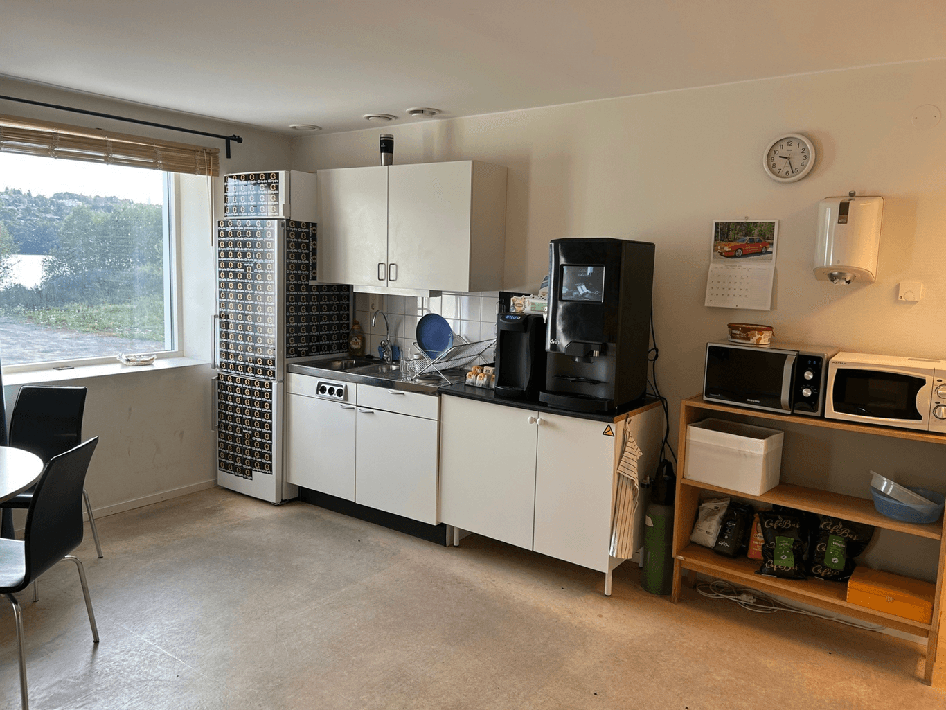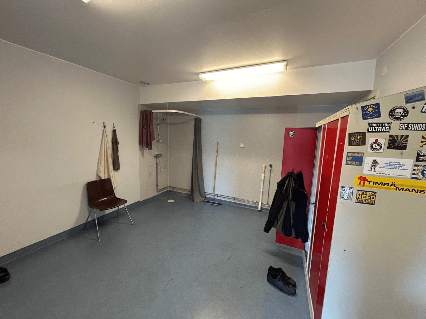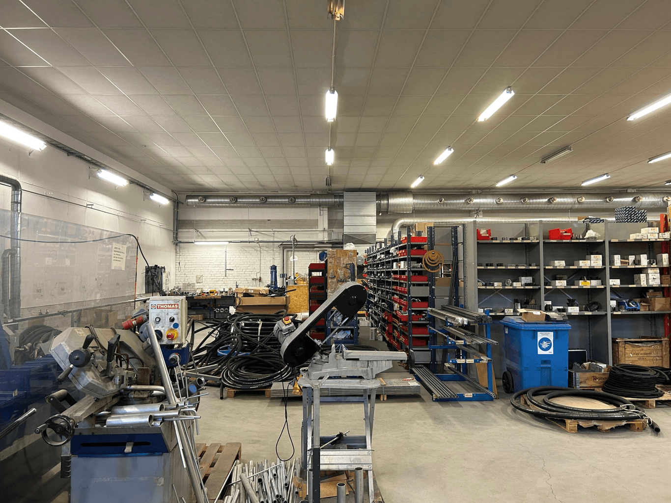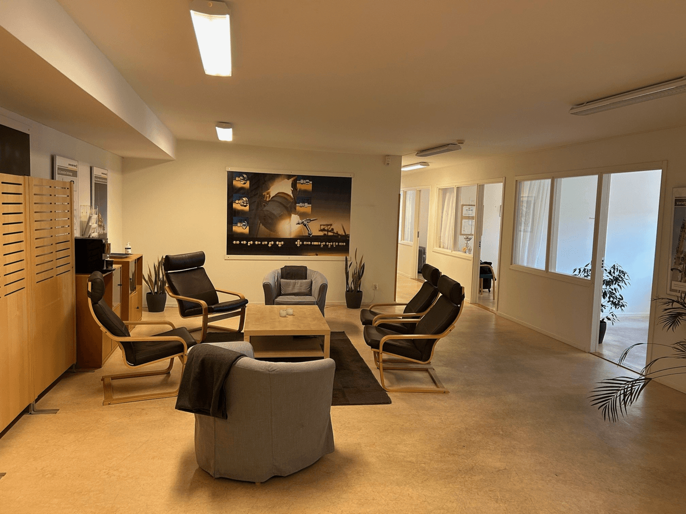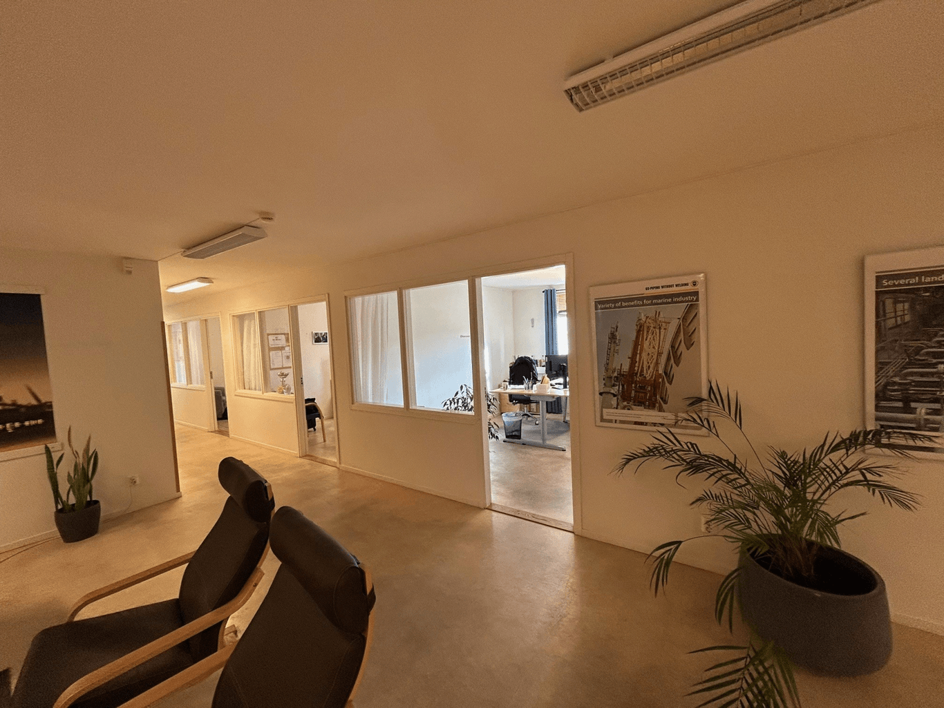 Fin lokal med högt i tak utan pelare. Kontor och personalutrymmen