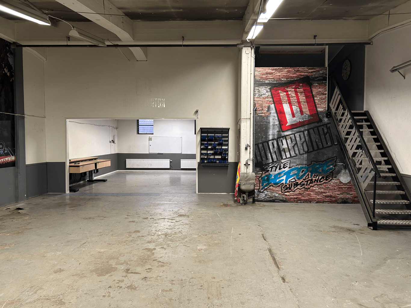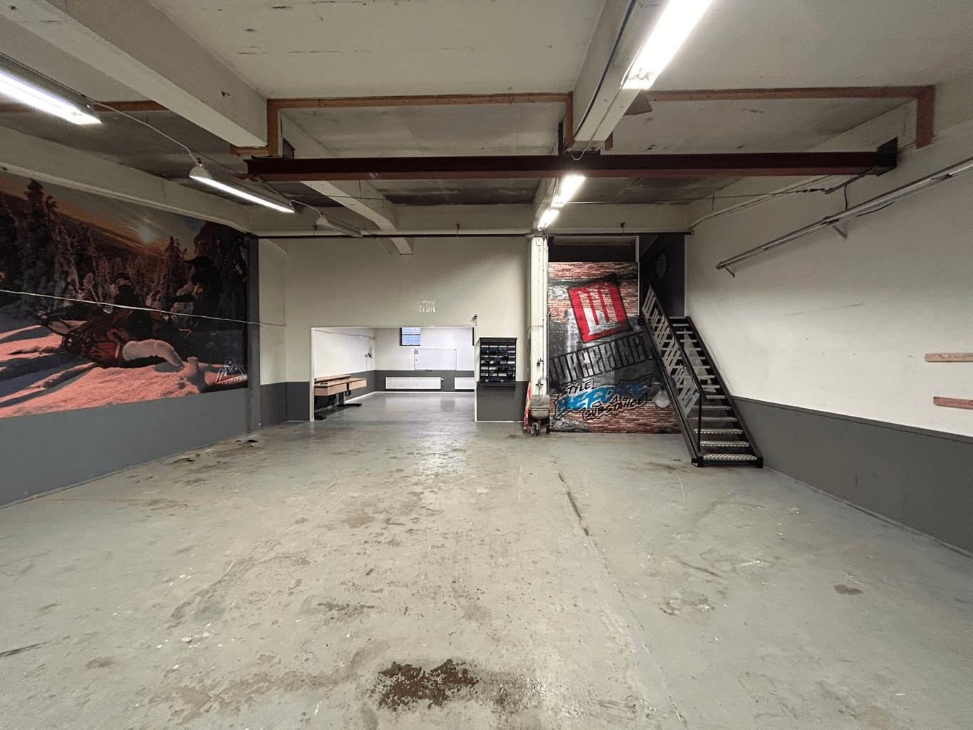 Garage med 1 st port ca 3x3 m. Kontor med tillhörande kontorsmöbler på bottenvåningen. Fikarum med trinettkök på entresolplan. Det finns tillgång till vatten samt 3-fasuttag i lokalen.