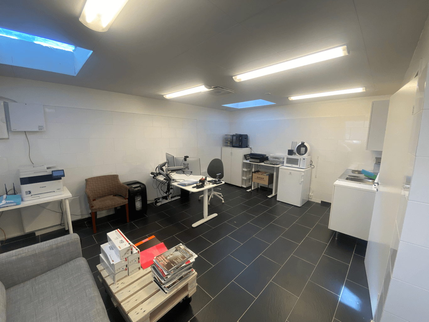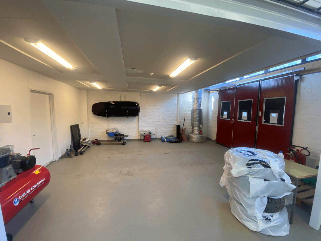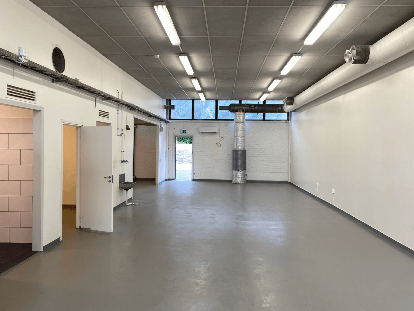Ljus och fräsch lokal med fönster åt bägge sidor. Porten är 3 m bred och 2,5 m hög.