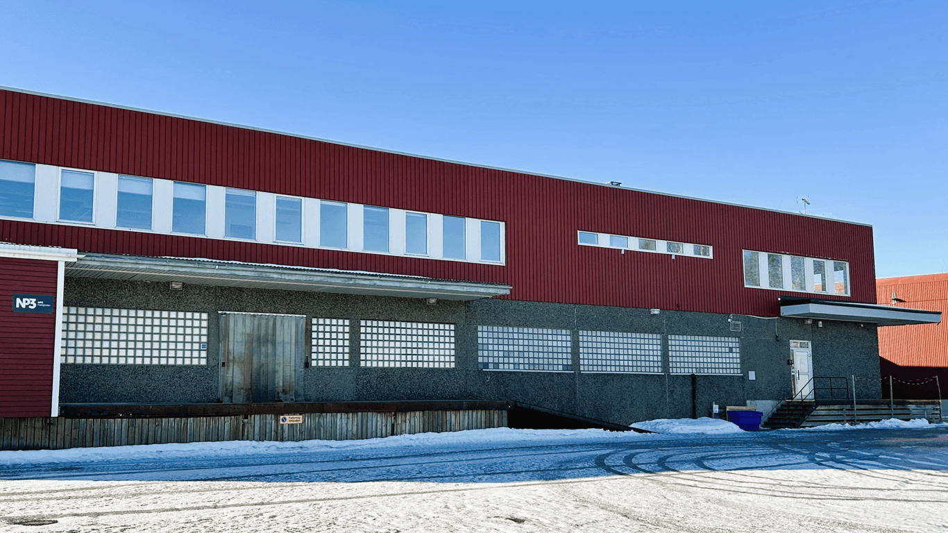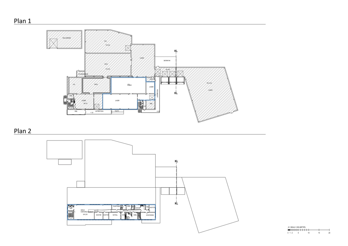 Lager på bottenplan, ca 312 kvm. Övre plan har kontor, fikarum och omklädningsrum med bastu, ca 310 kvm.