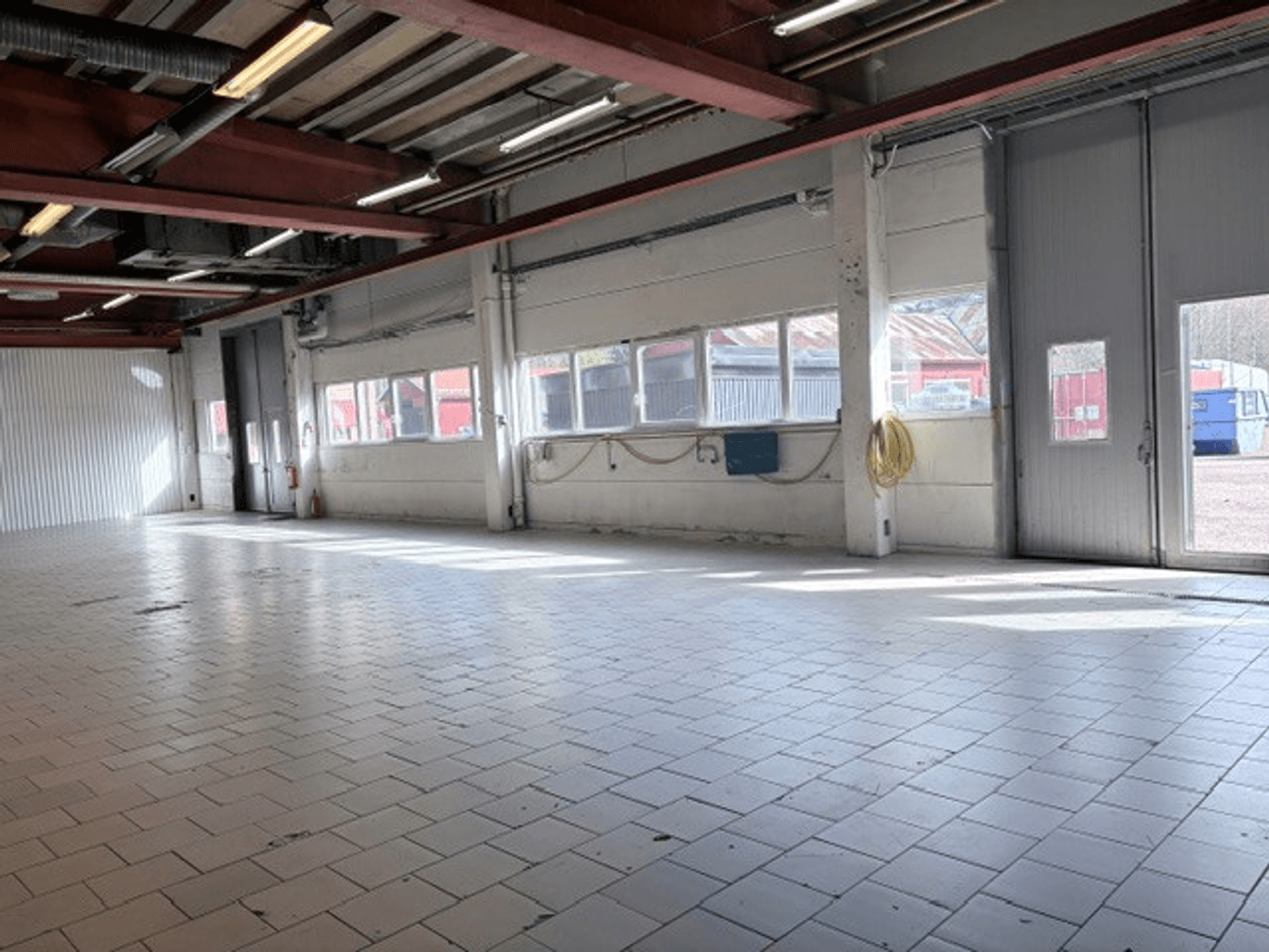 Lokal med öppen yta, två portar och travers.
