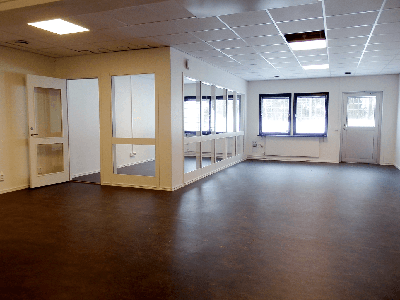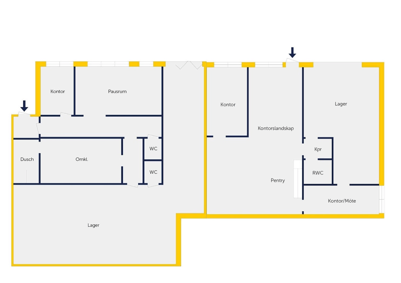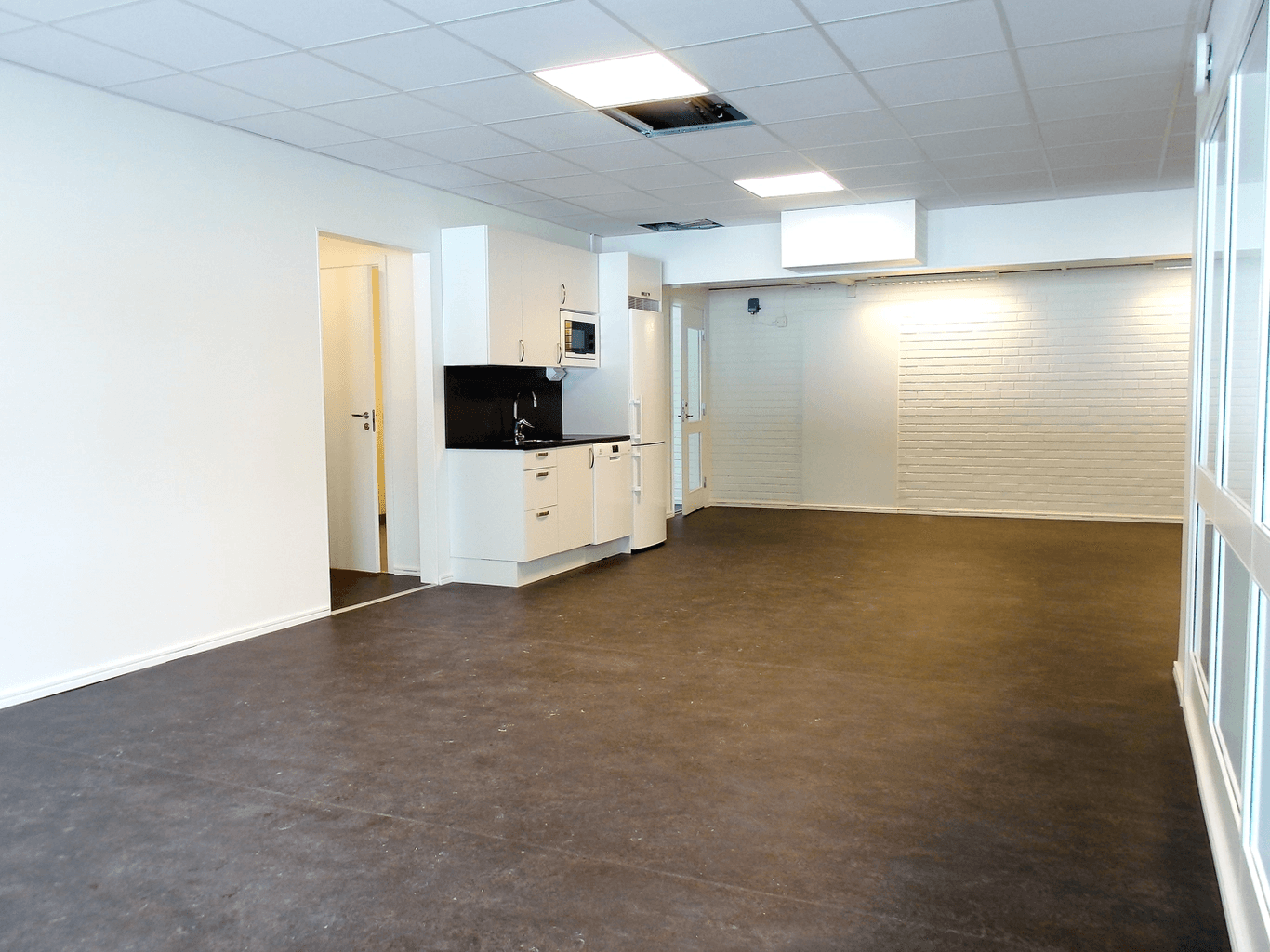 Lokalen är i dagsläget uppdelad på två separata lokaler men möjlighet finns att öppna upp mellan dem för att skapa en sammansatt yta.
