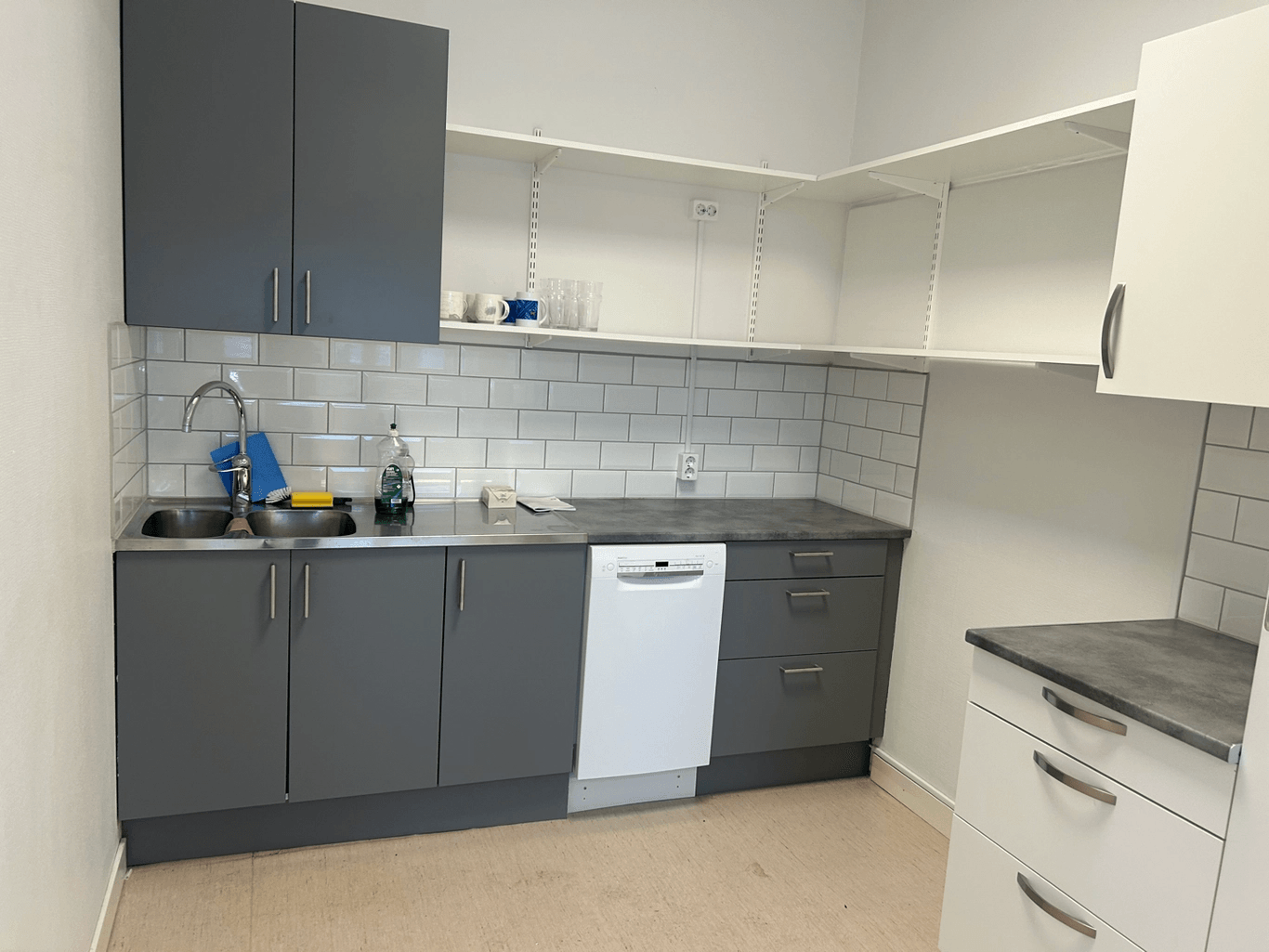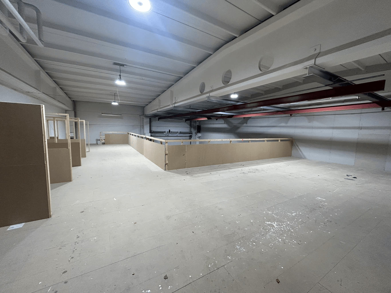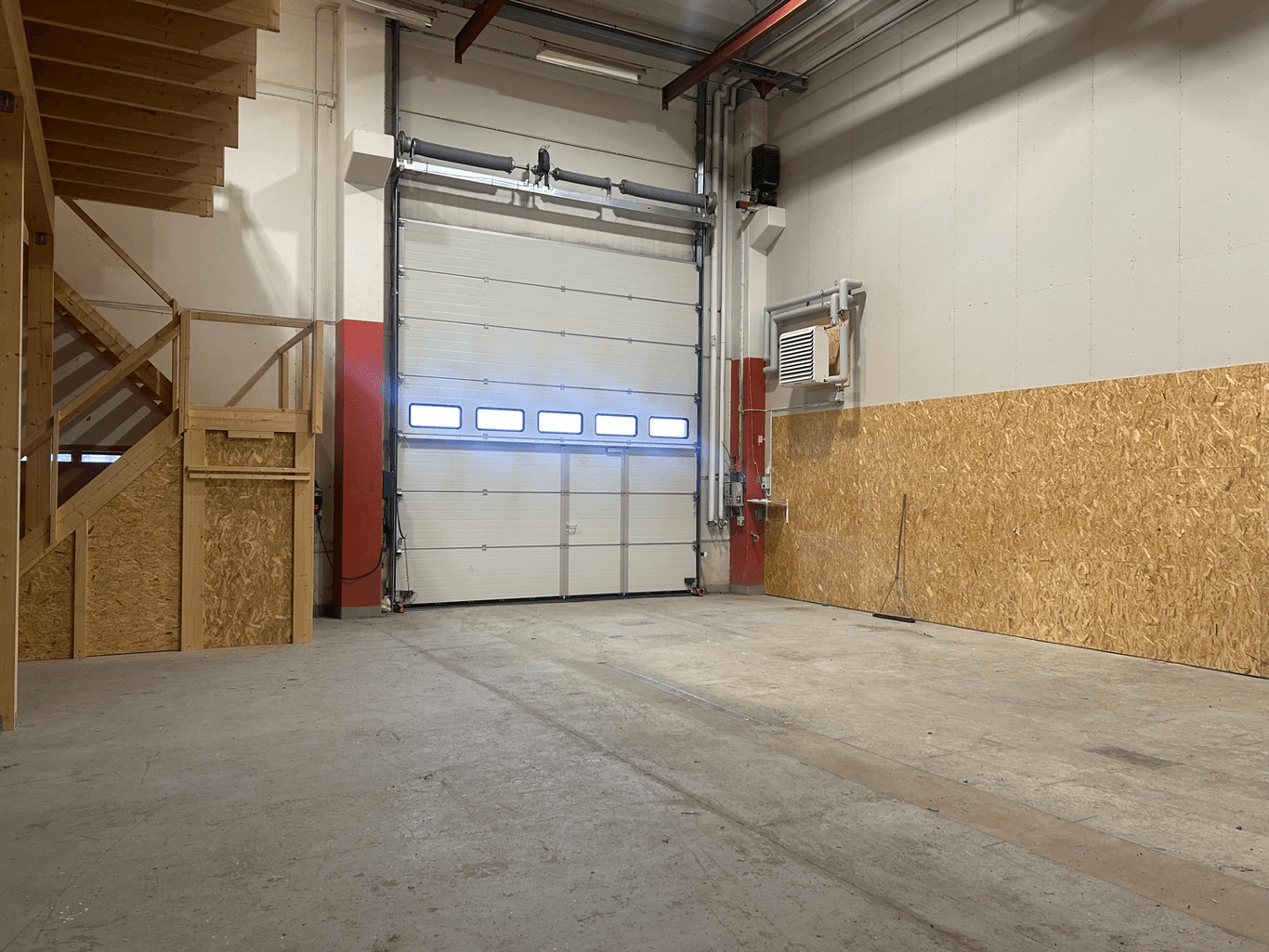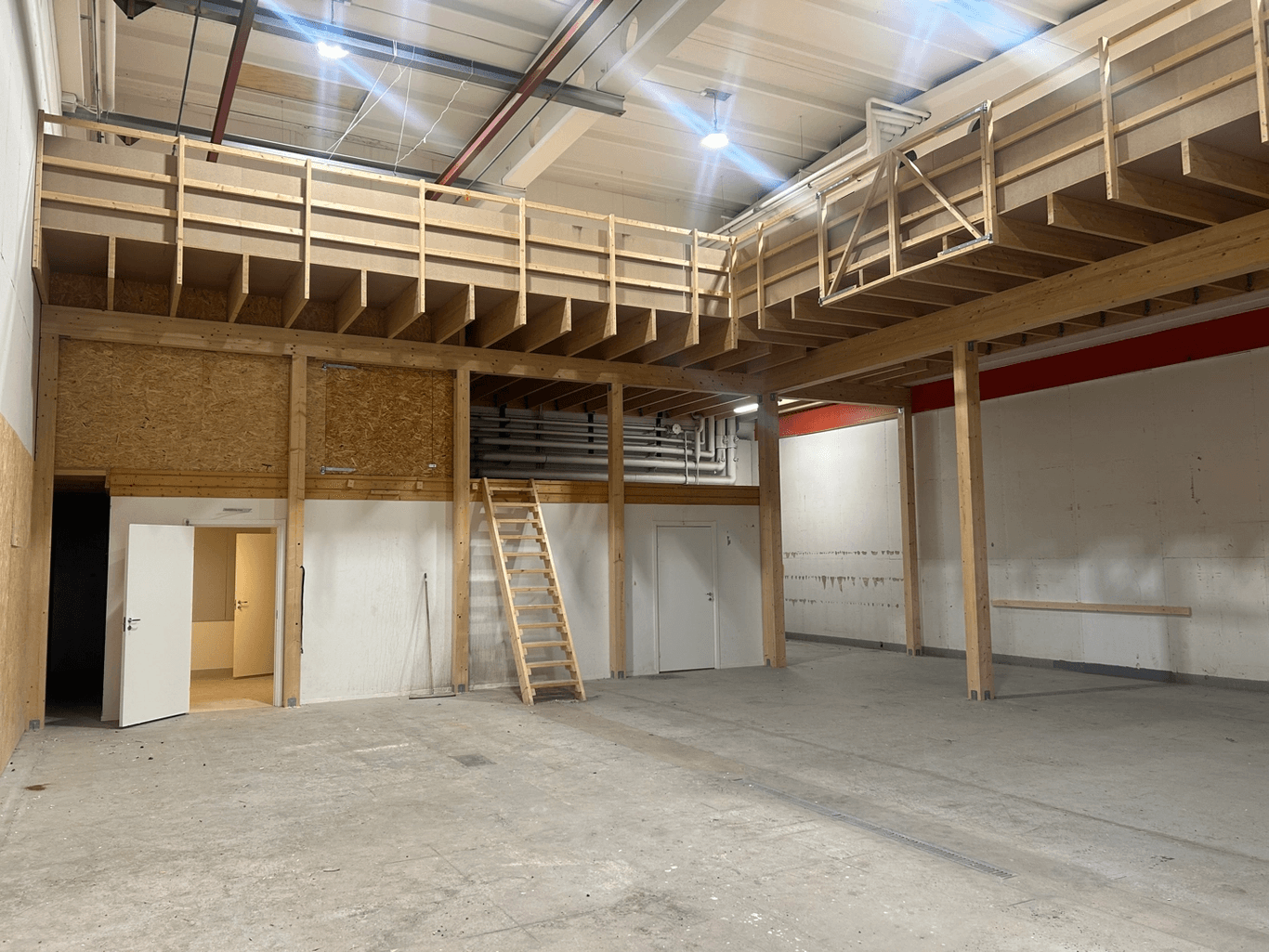 Lagerlokal med ett entresol som kan användas till lättare förvaring.