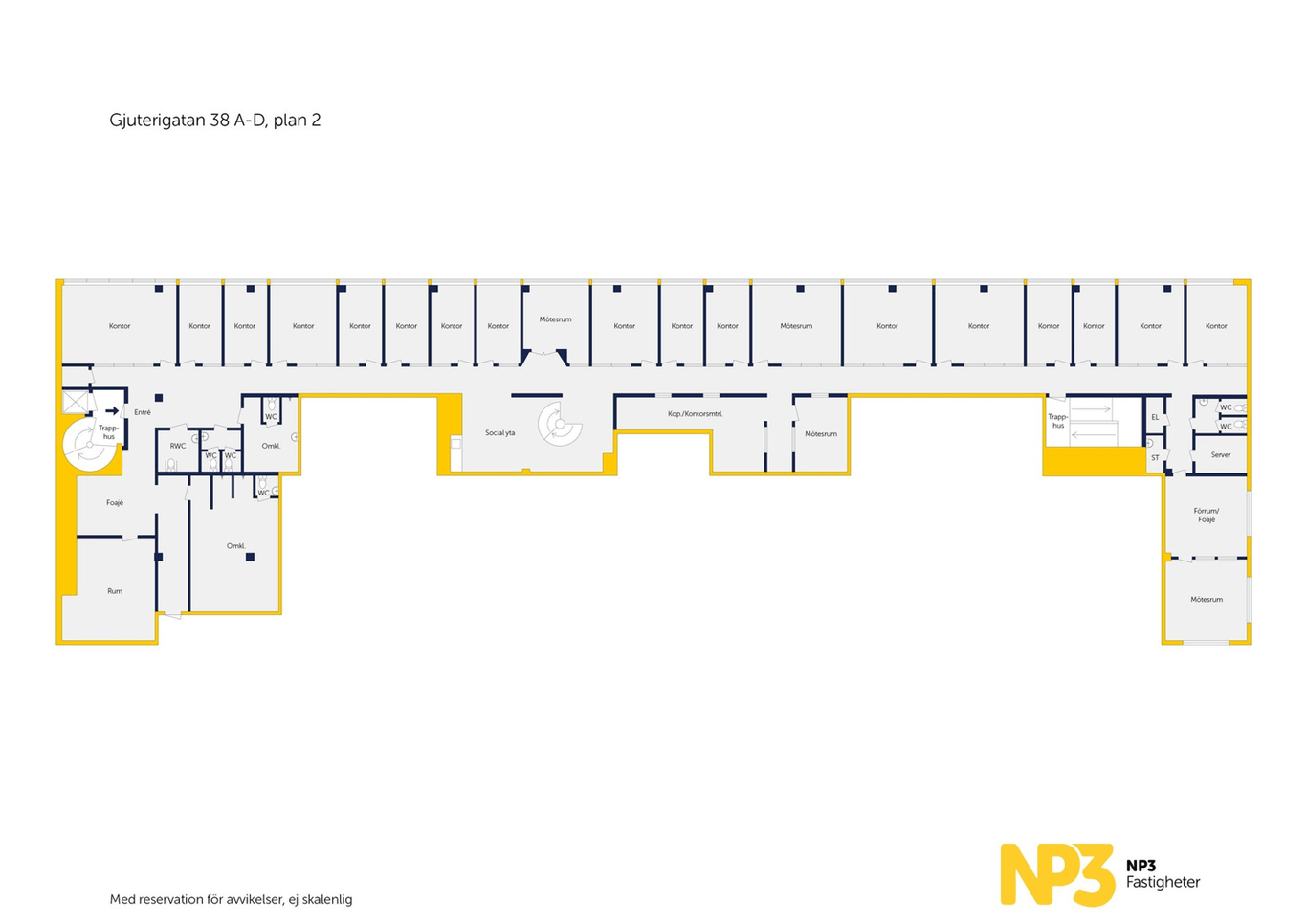 Lokalen är fördelad på ett plan och innefattar egna kontorsrum, omklädningsrum för både dam och herr samt personalytor.