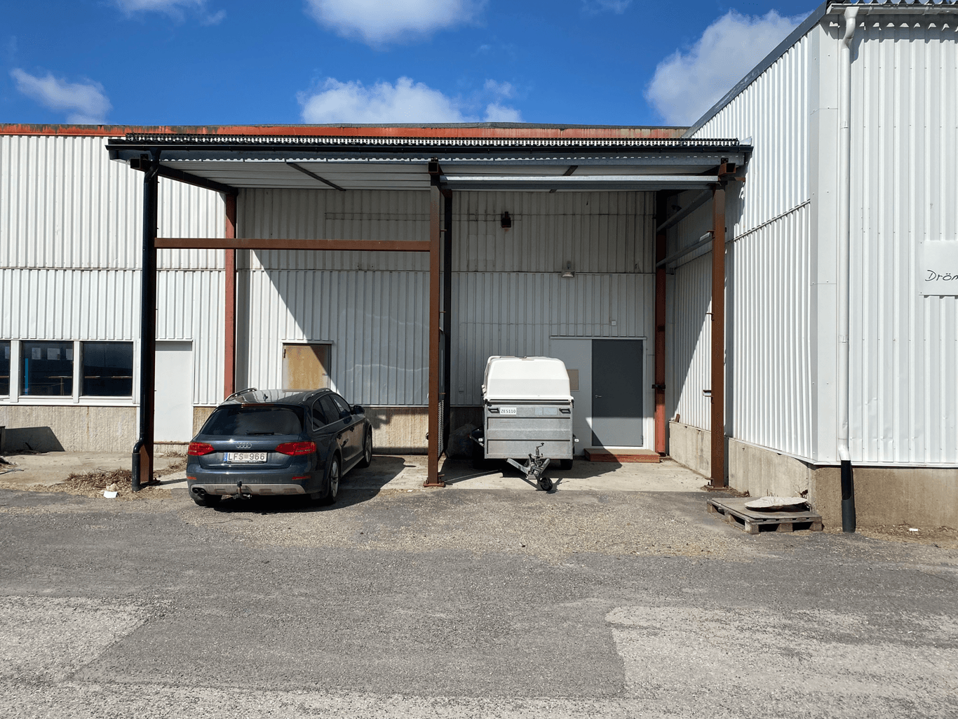 Fint garage i vinkel med högport 4x4,5 m (BxH). Kombinerat kontor och fikarum med omklädning samt WC och dusch i direkt anslutning till garaget. Det finns möjlighet att hyra uppställningsytor under tak (carport)